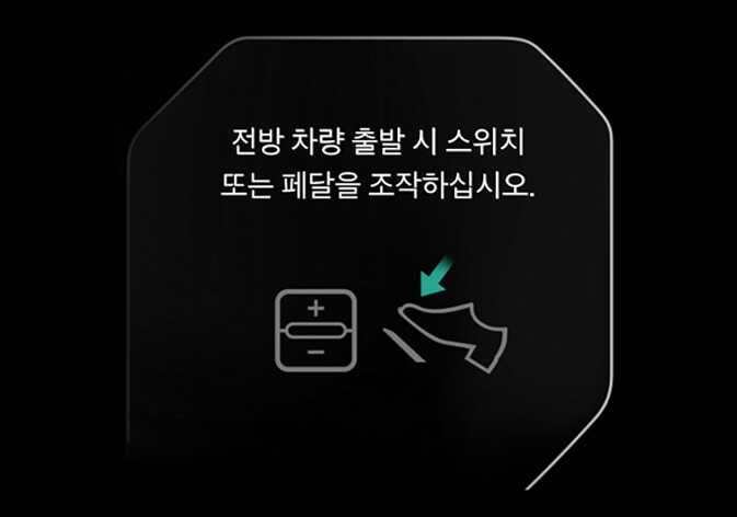 정차 후 일정 시간이 지나면 클러스터에 앞의 그림과 같이 안내문이 표시됩니다. 다시 출발하려면 가속 페달을 밟거나,