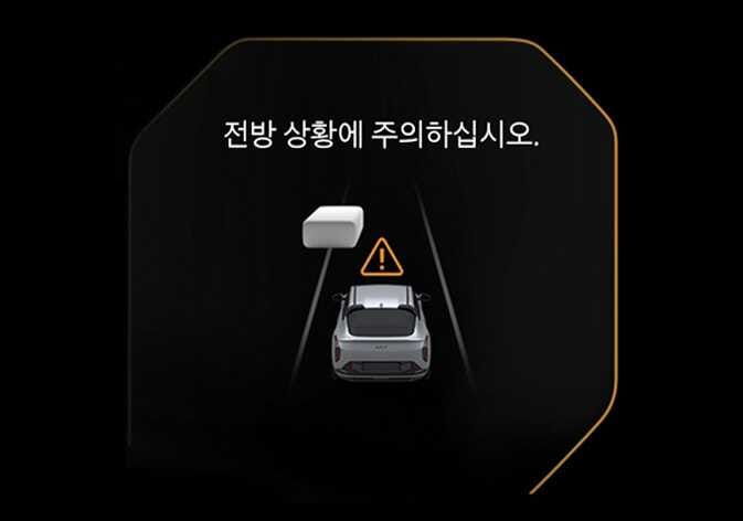 전방 상황 주의 알림이 발생하면 새롭게 나타난 전방의 차량이나 물체와 충돌할 수 있습니다. 전방 도로 상황 및 주행 상태를 확인하고 필요하면 브레이크 페달을 밟아 직접 속도를 조절하십시오.