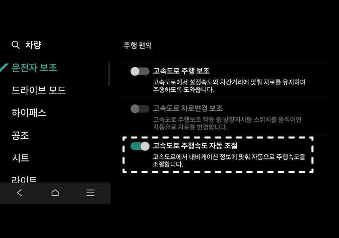 내비게이션 기반 스마트 크루즈 컨트롤에 이상이 발생한 경우 설정 메뉴에서 기능을 설정할 수 없습니다.