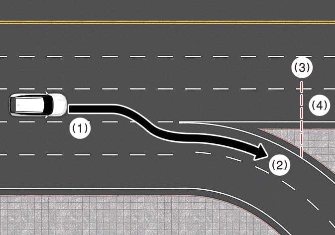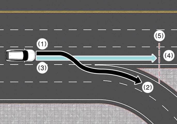 안내 경로(분기)와 주행 경로(본선)에 차이가 발생하면 주행 경로를 전용도로 본선으로 판단하기 전까지는 고속도로 안전구간 자동감속, 고속도로 곡선구간 자동감속 기능이 작동하지 않습니다.