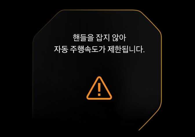 핸즈오프에 의해 고속도로 주행 보조가 꺼지면 주행속도가 제한됩니다. 주행속도 제한 기능이 작동하는 중에는 지속해서 경고문이 표시되고, 경고음이 울립니다.