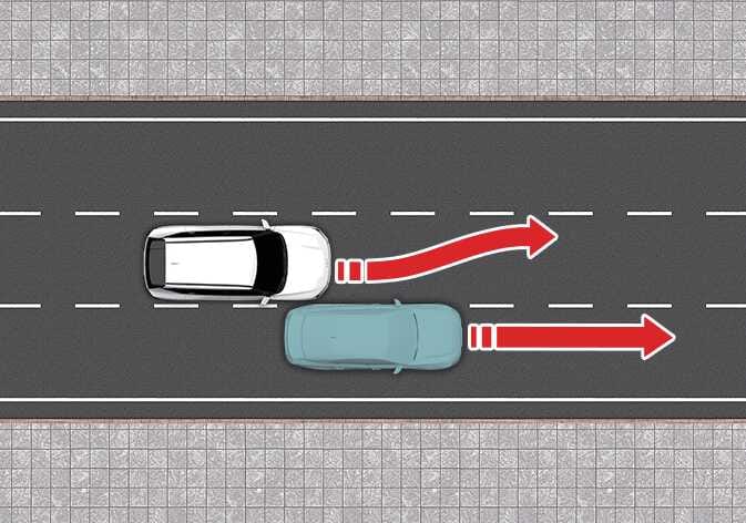 주행속도가 약 60 km/h 이상인 경우, 옆 차로에 근접 차량이 있으면 차로 내에서 반대 방향으로 편향하여 주행하도록 도와줍니다. 옆 차로 모두에 근접 차량이 있으면 편향하여 주행하지 않습니다.
