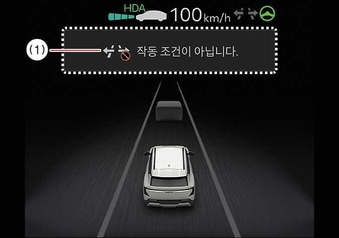 고속도로 차로변경 보조 기능이 꺼질 경우(편도 1차로가 될 경우, 전방에 교차로/횡단보도가 있을 경우, 물리적인 중앙 분리 구조물(가드레일 등)이 없는 도로에 진입할 경우, 주행 차로에 보행자 또는 자전거가 있을 경우)