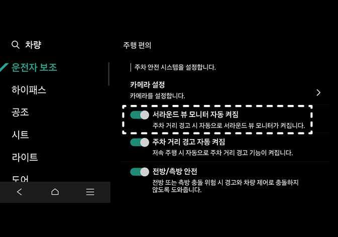 서라운드 뷰 모니터 자동 켜짐 N_CT25Z218 서라운드 뷰 모니터의 자동 켜짐 기능을 설정하려면 DRIVE READY 상태에서 인포테인먼트 시스템의 설정 > 차량 > 운전자 보조 > 주차 안전 > 서라운드 뷰 모니터 자동 켜짐을 차례로 선택하십시오.