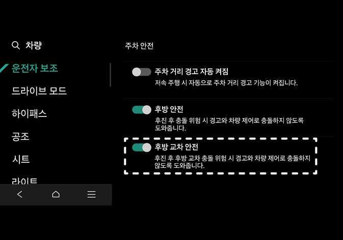 DRIVE READY 상태에서 인포테인먼트 시스템의 을 차례로 선택하십시오. 후방 교차 충돌방지 보조가 켜집니다.