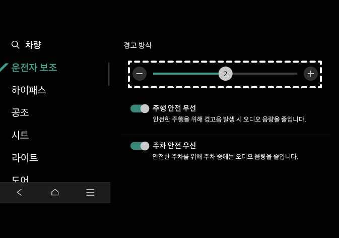 경고 방식을 변경하면 다른 운전자 보조 시스템의 경고 방식도 같이 변경될 수 있습니다. 고려하여 변경하십시오.