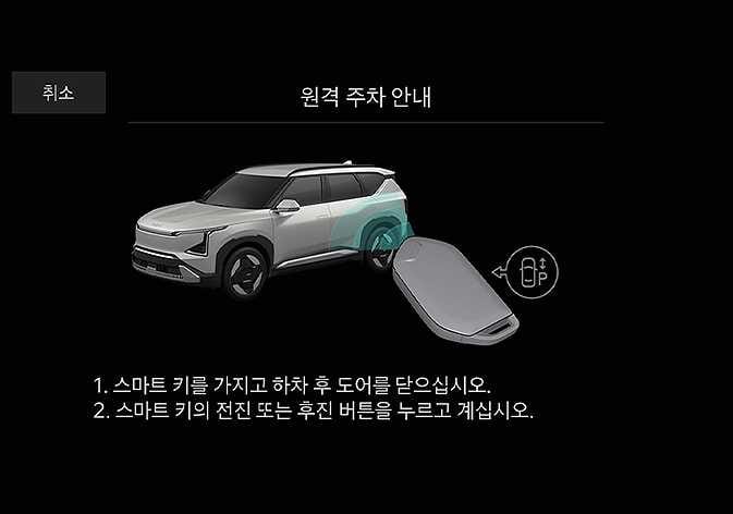 원격 스마트 주차 보조가 켜지고 인포테인먼트 시스템 화면에 안내문이 표시됩니다.