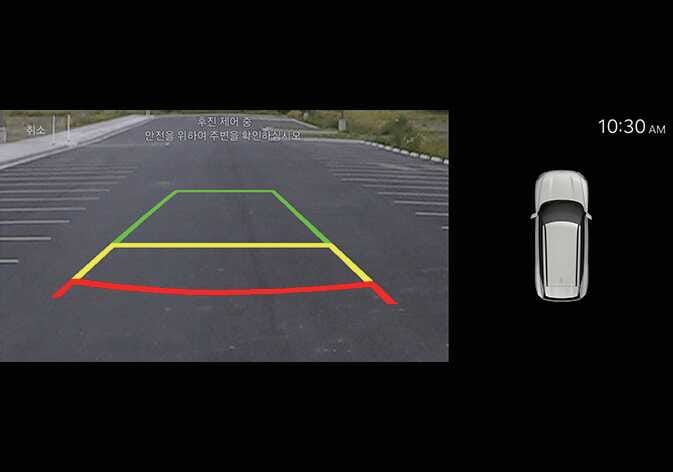 서라운드 뷰 모니터 화면에 표시되는 탐색된 주차 위치는 스마트 주차 기능으로 차량이 주차공간에 처음 진입할 때까지만 표시됩니다.