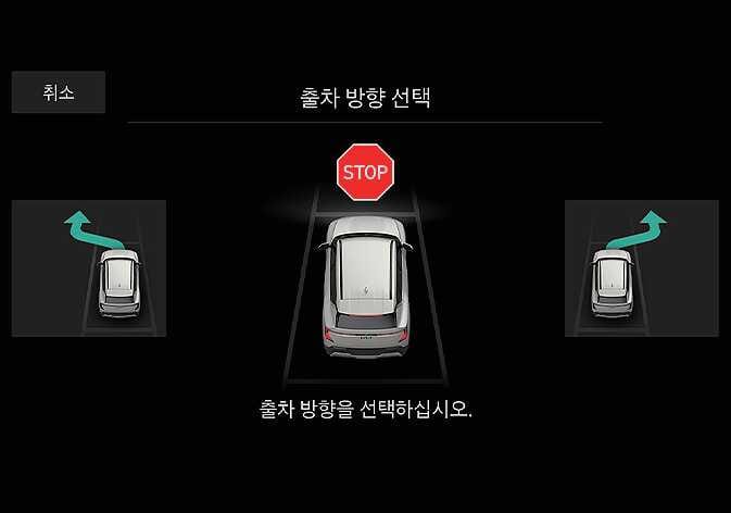 브레이크 페달을 밟아 정차한 상태에서 인포테인먼트 시스템 화면을 터치하여 원하는 출차 방향을 선택하십시오.