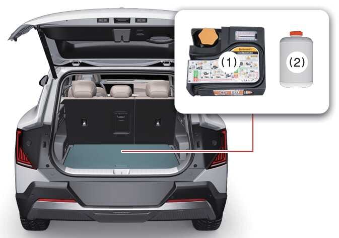 타이어 임시 수리 장치는 트레드부(바닥면)만 봉합 가능하며, 타이어의 측면 손상은 봉합할 수 없습니다. 타이어 임시 수리 장치는 못이나 날카로운 물체로 인한 트레드부(바닥면) 펑크로 타이어 공기압이 충분하지 않은 경우에 한해 사용하십시오.