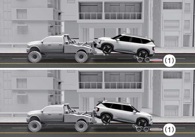 견인하는 가장 좋은 방법은 견인 차량에 차량을 실어 운반하는 상차 견인이며 상차 견인이 불가할 경우에는 앞 또는 뒷바퀴를 지그에 올리고 나머지 타이어를 지면에 닿지 않도록 돌리(1)를 사용하여 견인하십시오.