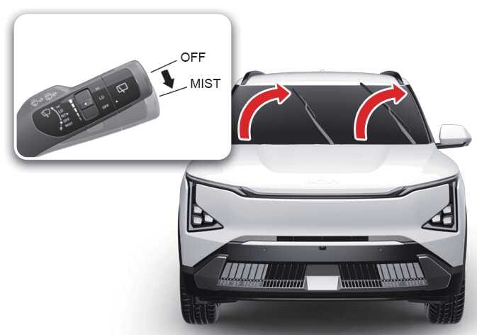 약 20초 이내에 와이퍼가 최상단으로 올라갈 때까지 와이퍼 스위치를 약 2초 이상 MIST 위치로 조작하십시오.