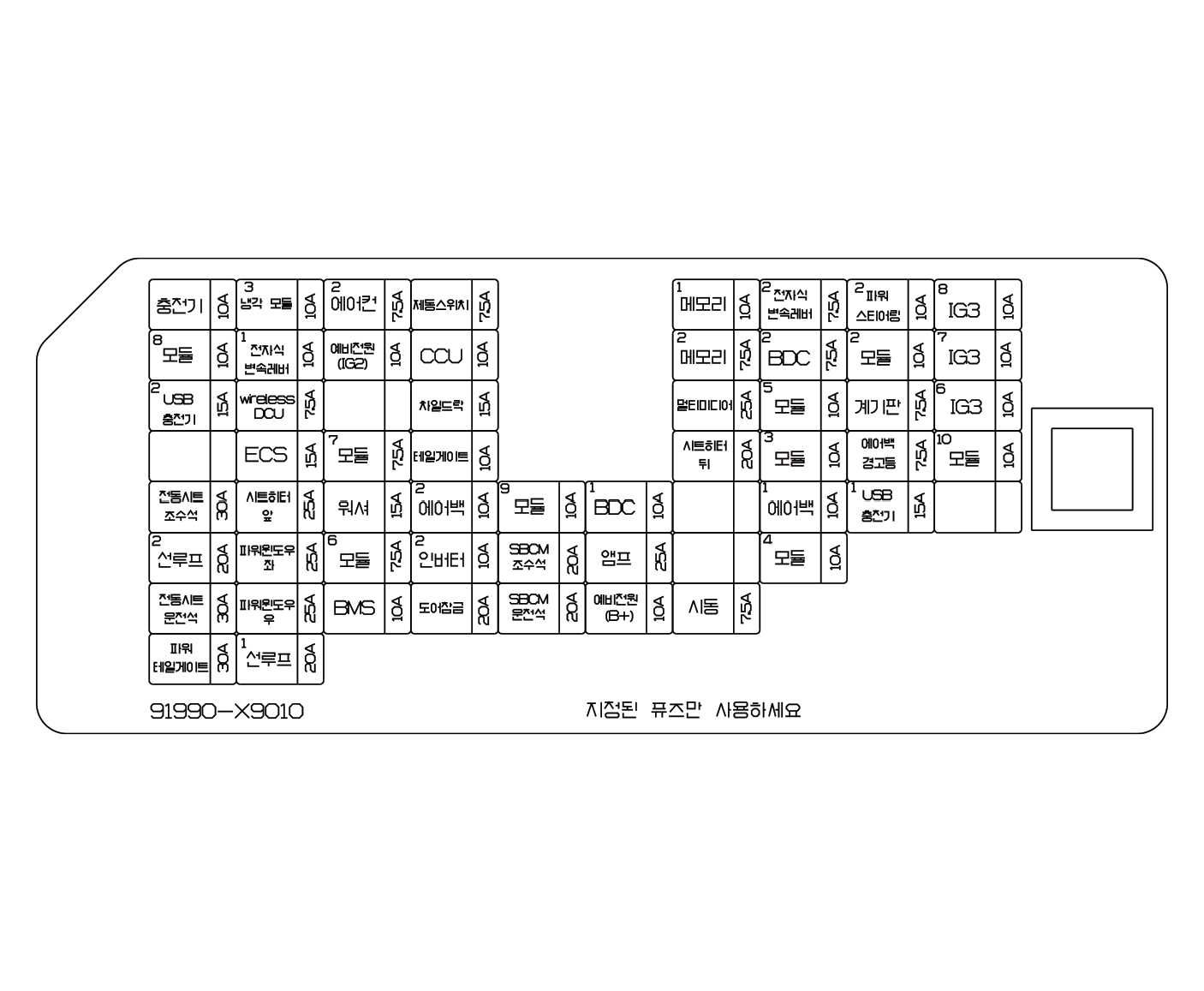 모터룸 퓨즈 박스 내 이름 없는 공란 퓨즈는 예비 퓨즈가 아니므로 임의로 빼지 마십시오. 임의로 뺄 경우 해당 시스템이 작동하지 않을 수 있습니다.