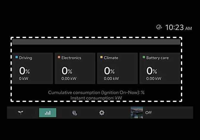 U kunt het huidige energieverbruik van elk systeem van het voertuig bekijken door op het scherm te selecteren.