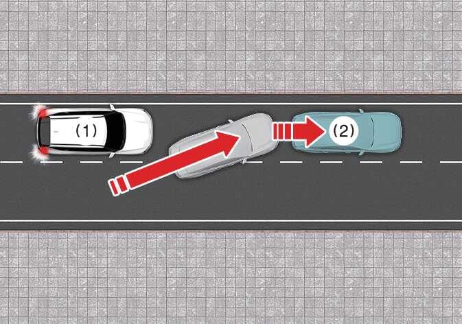 (1): Uw auto, (2): Voorligger Als een voertuig voor uw auto invoegt, is het mogelijk dat de functie Waarschuwing vertrek voorliggend voertuig niet goed functioneert. |