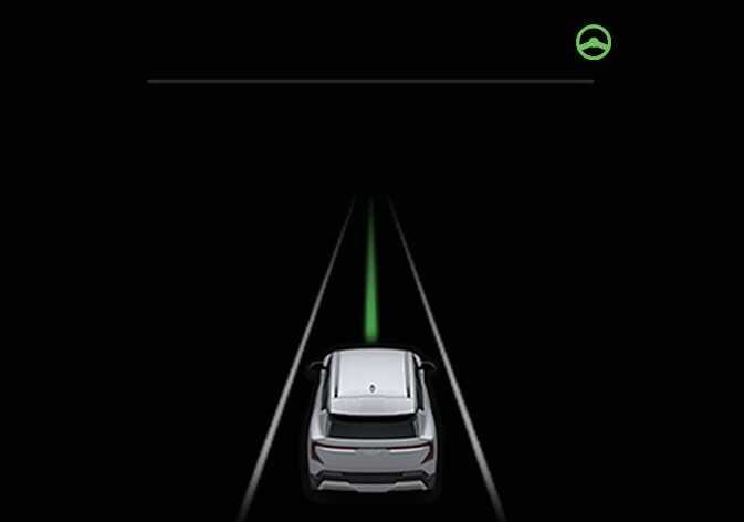 Als beide rijstrookmarkeringen worden gedetecteerd of als een voorafgaand voertuig binnen de erkende rijstroken wordt gedetecteerd en de voertuigsnelheid lager is dan de werksnelheid, helpt het systeem bij het sturen om de auto in het midden van de rijstrook te houden. In dit geval gaat de groene indicator (