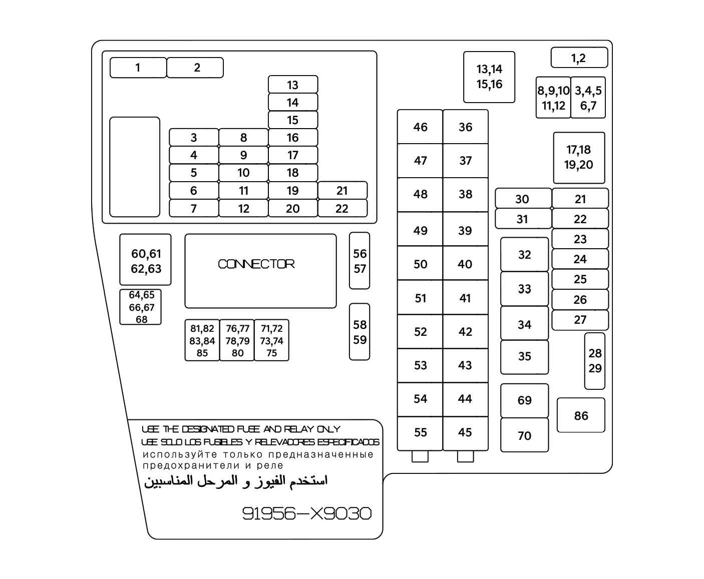 PDC-aansluitblok (langetermijnvergrendelingsrelais, IPS13, zekering: MULTIMEDIA, GEHEUGEN 1, GEHEUGEN 2, KINDERSLOT, REMSYSTEEM SW, MODULE 9, CCU, SBCM DRV, SBCM PASS, DR SLOT, ACHTERKLEP OPEN) |