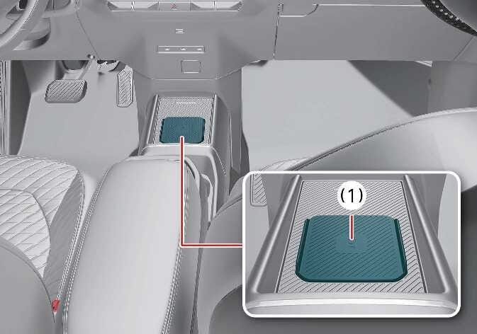 Nachdem Sie in der Kia-App oder Kia-Connect-App auf gedrückt haben, legen Sie die Rückseite des Smartphones auf das Authentifizierungspad im Fahrzeug (kabelloses Ladepad).