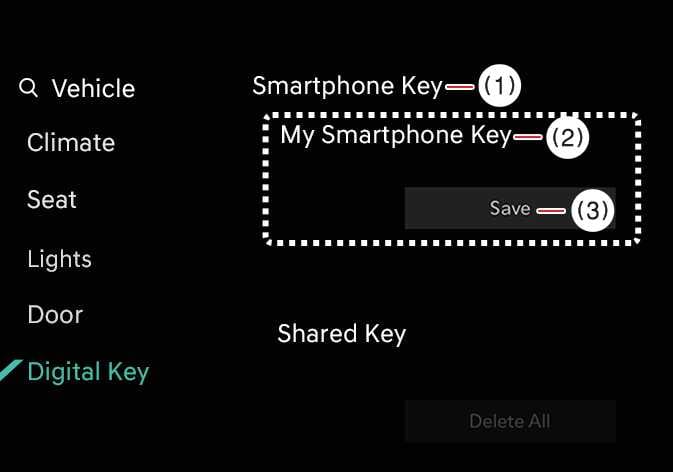 Wenn bereits ein digitaler Schlüssel (Smartphone) im Fahrzeug gespeichert ist, wird am Infotainment-System-Menübildschirm des Smartphone-Schlüssels Alle löschen angezeigt und auf dem Bildschirm Mein Smartphone-Schlüssel wird Löschen angezeigt. Wenn Sie einen digitalen Schlüssel erneut speichern möchten,So löschen Sie den digitalen Schlüssel (Smartphone).