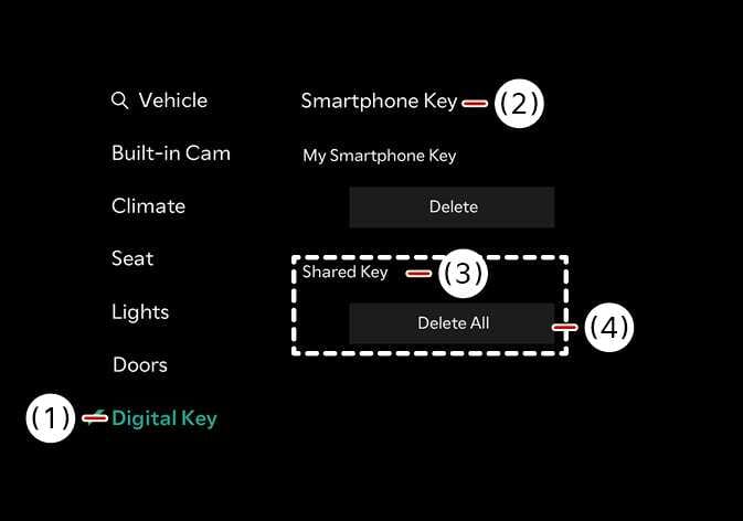 Schalten Sie das Fahrzeug mit dem Smart-Key ein und achten Sie darauf, dass der Smart-Key während des Verfahrens zum Löschen des digitalen Schlüssels (Smart-Phone) im Fahrzeug verbleibt.