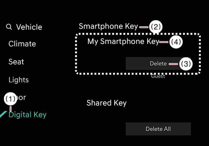 Wenn der digitale Schlüssel (Smartphone) auf dem Smartphone gelöscht wird, wird auch der im Fahrzeug gespeicherte digitale Schlüssel gelöscht.
