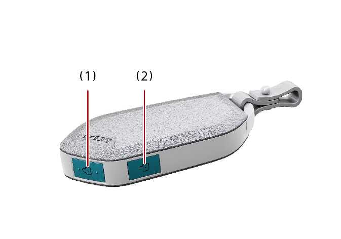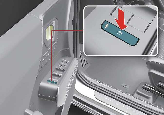 Drücken Sie die Türentriegelungstaste (2) länger als 3 Sekunden. Das Fenster bewegt sich nach unten, nachdem die Türen entriegelt wurden, solange Sie die Türentriegelungstaste (2) drücken.
