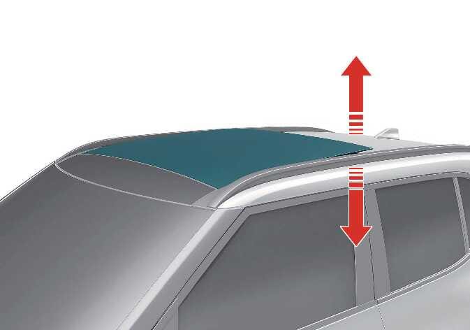 Wenn Sie den Schiebedachschalter nach oben oder nach vorne drücken, stellt sich das Schiebedachglas auf. Das Schiebedachglas schließt sich.
