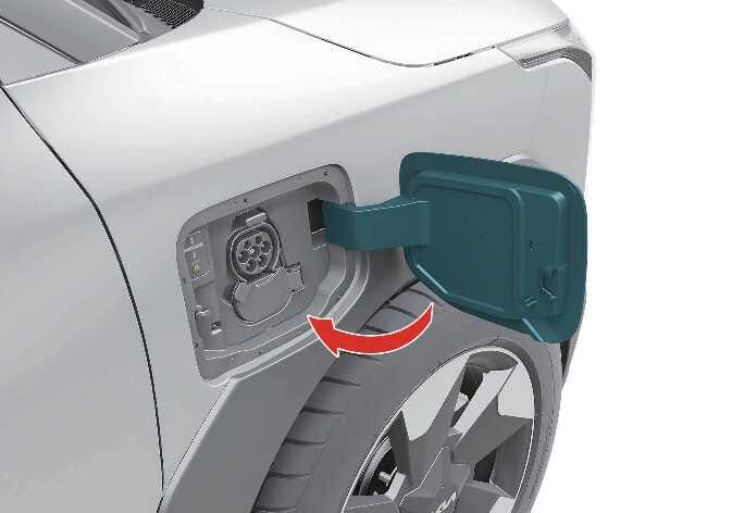 Verschließen Sie nach dem Laden des Fahrzeugs den Ladeeingang mit der Ladeeingangsabdeckung einwandfrei. Wenn die Ladeeingangsabdeckung unsachgemäß geschlossen wird, können der Ladeeingang und die Ladeklappe beschädigt werden.