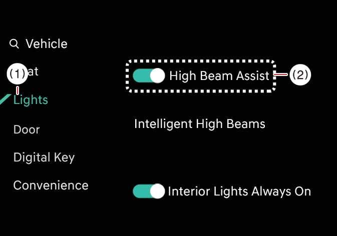 Wählen Sie bei eingeschaltetem Fahrzeug im Menü Einstellungen die Option , um die Fernlichtassistent-Funktion zu aktivieren.