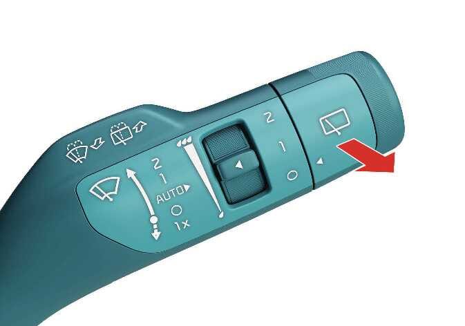 - Ziehen Sie den Hebel vorsichtig zu sich hin, um Waschflüssigkeit auf die Windschutzscheibe zu sprühen, und lassen Sie die Scheibenwischer 1–3 Mal laufen, wenn die Windschutzscheibe verschmutzt ist. Der Sprüh- und Wischvorgang wird fortgesetzt, bis Sie den Hebel freigeben.