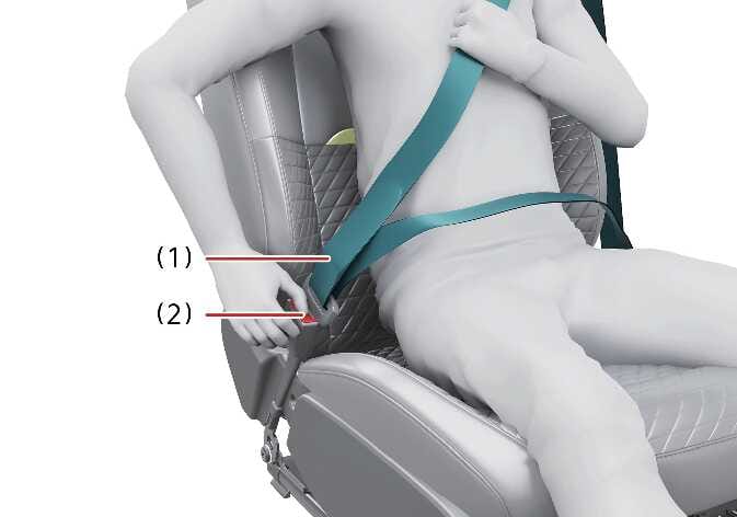 Um den Sicherheitsgurt anzulegen, ziehen Sie ihn aus der Aufrollvorrichtung und führen Sie die Metalllasche (1) in die Schnalle (2) ein. Ein Klickgeräusch zeigt an, dass die Schließzunge im Gurtschloss verriegelt ist.