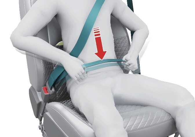 Der Sicherheitsgurt passt sich erst dann automatisch auf die richtige Länge an, wenn Sie den Beckengurt manuell so eingestellt haben, dass er eng an Ihren Hüften anliegt. Wenn Sie sich langsam und ruckfrei nach vorn beugen, verlängert sich das Gurtband, so dass Sie sich frei bewegen können. Bei einer Vollbremsung oder einem Aufprall rastet der Gurt jedoch in seiner Position ein. Der Gurt rastet auch ein, wenn Sie versuchen, sich schnell nach vorn zu beugen.