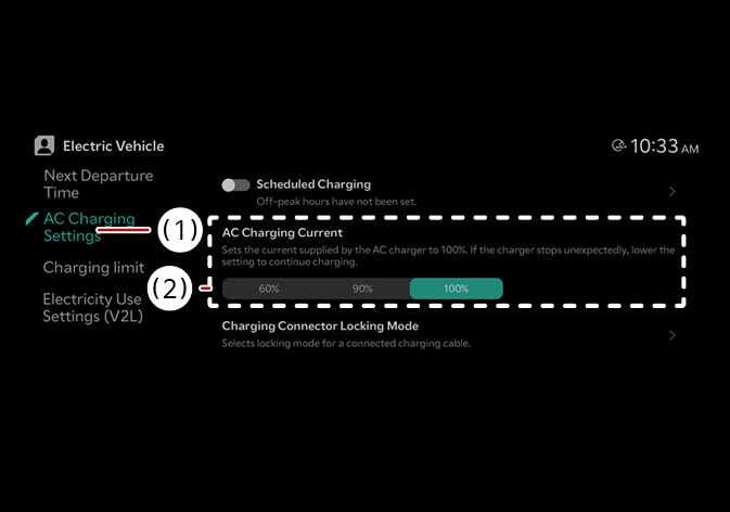 Bei manchen Wechselstromladegeräten mit hoher Kapazität (Ladegeräte mit einer Stromkapazität, die größer ist als die Stromkapazität, die das Fahrzeug aufnehmen kann) ändert sich der Ladestrom möglicherweise nicht, selbst wenn Sie die Einstellung ändern.