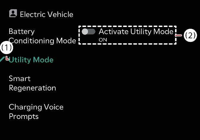 Das Fahrzeug nutzt die Hochspannungsbatterie statt der 12V-Batterie, um Komfortfunktionen zu nutzen. Wenn keine Energie für die Fahrt selbst benötigt wird, beispielsweise beim Camping oder bei einem längeren Stopp des Fahrzeugs, können Sie die Elektrogeräte (Audioanlage, Beleuchtung usw.) viele Stunden nutzen.