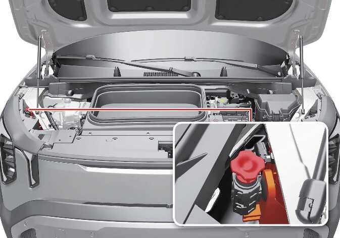 Wenn sich das Ladekabel wegen Entladung der Batterie oder defekter Kabel nicht löst, öffnen Sie die Haube und ziehen Sie leicht am Notstromkabel auf der linken Seite des Motorraums, wie in der Abbildung gezeigt. Der Ladestecker wird dann entriegelt.
