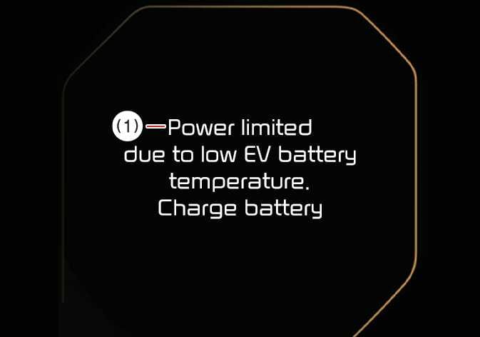Die Warnmeldung wird angezeigt, um das Elektrofahrzeug zu schützen, wenn Sie das Fahrzeug einschalten, während die Temperatur der Hochspannungsbatterie niedrig ist. Die Leistung kann eingeschränkt sein, wenn der Ladezustand der Hochspannungsbatterie niedrig ist und das Fahrzeug über einen längeren Zeitraum bei niedrigen Temperaturen im Freien geparkt ist. Wenn Sie die Batterie vor der Fahrt aufladen, erhöht sich die Batterietemperatur und die Leistung wird gesteigert.