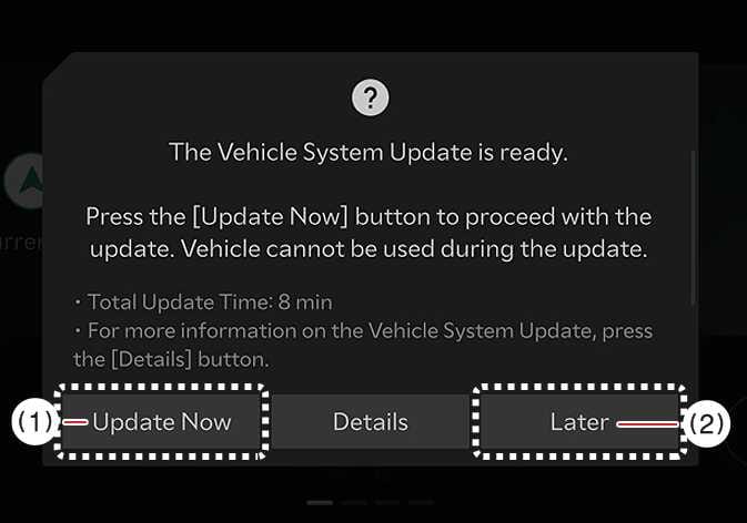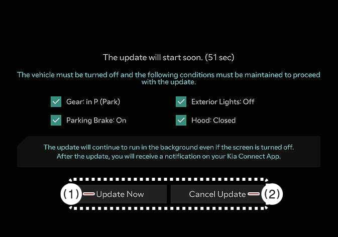 Wenn Sie auf dem Bildschirm die Schaltfläche Jetzt aktualisieren drücken, beginnt das Fahrzeug automatisch mit der Installation des Updates. Die folgenden Bedingungen müssen erfüllt sein: