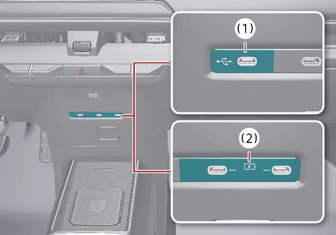 Nach Anschluss eines Medienspeichergeräts, wie eines MP3-Players oder eines USB-Laufwerks, können Sie Musik über die Lautsprecher des Fahrzeugs oder das Infotainment-System abspielen (1).