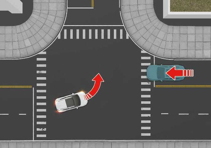 Wenn Sie bei eingeschaltetem Blinker an einer Kreuzung nach links abbiegen, kann die Abbiegefunktion eine Notbremsung durchführen, um eine Kollision mit einem Fahrzeug, einem Motorrad oder einem Fahrrad in einer Gegenfahrspur zu vermeiden.