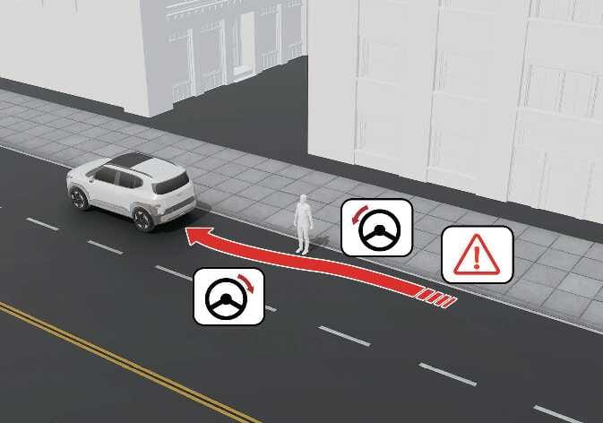 Die Ausweichlenkunterstützung hilft, eine Kollision mit einem Fußgänger oder Fahrrad vor dem Fahrzeug auf der gleichen Fahrspur zu vermeiden. Wenn Ihr Fahrzeug eine Kollisionsgefahr erkennt, warnt Sie die Ausweichlenkunterstützung und unterstützt Sie bei der Lenkung, wenn Sie das Lenkrad bewegen.