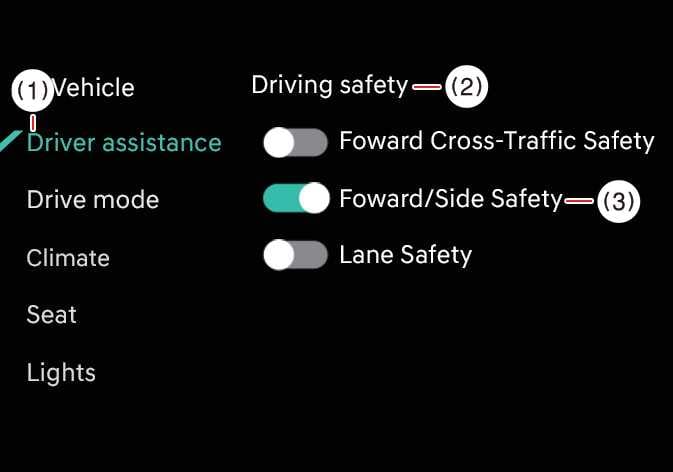 Tippen Sie bei eingeschaltetem Fahrzeug auf dem Bildschirm des Infotainment-Systems auf, um die Einstellungen für die Kollisionsvermeidung in Fahrtrichtung/Seite zu ändern.