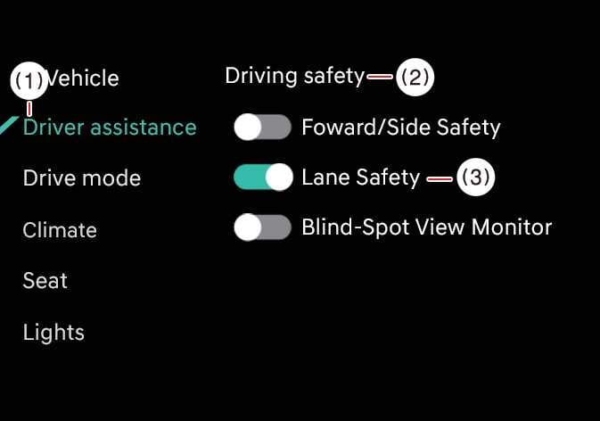 Tippen Sie bei eingeschaltetem Fahrzeug auf dem Bildschirm des Infotainment-Systems auf , um die Einstellungen für die Spursicherheit zu ändern.