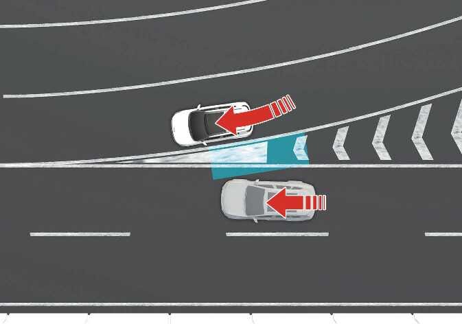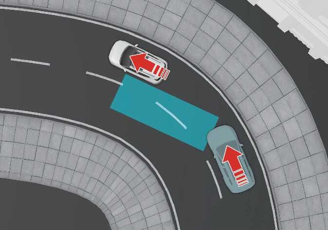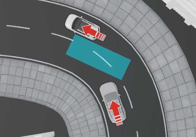 N_QVe27_B10_025_EDer Totwinkel-Kollisionsvermeidungsassistent funktioniert möglicherweise nicht richtig, wenn Sie auf einer kurvigen Straße fahren. Der Totwinkel-Kollisionsvermeidungsassistent kann das Fahrzeug in der benachbarten Fahrspur nicht erkennen.
