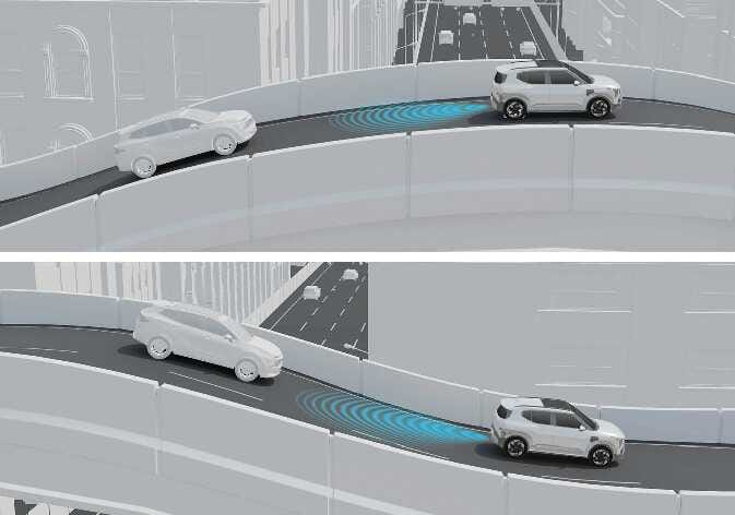 N_QVe27_B10_028_EDer Totwinkel-Kollisionsvermeidungsassistent funktioniert möglicherweise nicht richtig, wenn die Fahrspuren abweichende Höhen haben. In manchen Fällen kann das System ein Fahrzeug auf einer Straße mit unterschiedlichen Fahrspurhöhen nicht erkennen (z. B. bei Unterführungen, höhenfreien Kreuzungen usw.). Achten Sie stets auf die Straßen- und Fahrbedingungen.
