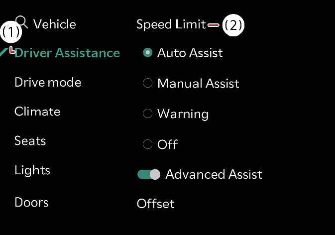Differenz der Geschwindigkeitsbegrenzung: Legt eine Abweichung zur Geschwindigkeitsbegrenzung fest. Die Einstellung der Geschwindigkeit erfolgt basierend auf der Geschwindigkeitsbegrenzung der Straße zuzüglich des Abweichungswertes.