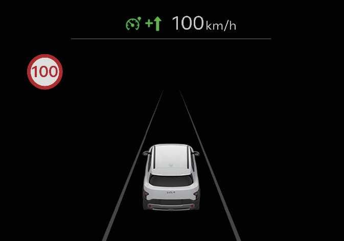 Wenn das Menü manueller Geschwindigkeitsbegrenzungsassistent oder intelligente Tempomatsteuerung ausgewählt ist und sich die Geschwindigkeitsbegrenzung auf der Straße ändert, während der manuelle Geschwindigkeitsbegrenzungsassistent oder die intelligente Tempomatsteuerung in Betrieb ist, wird ein Pfeil nach oben oder unten angezeigt, um darauf hinzuweisen, dass die eingestellte Geschwindigkeit angepasst werden muss. Sie können die Einstellgeschwindigkeit entsprechend der Geschwindigkeitsbegrenzung ändern, indem Sie den Schalter (