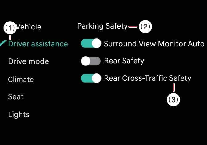 Tippen Sie bei eingeschaltetem Fahrzeug am Bildschirm des Infotainment-Systems auf , um den Heckverkehr-Kollisionsvermeidungsassistenten einzuschalten.