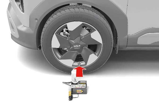 Achten Sie darauf, dass der Reifen dabei nicht platzt, und halten Sie sich beim Auffüllen des Reifens vom Reifen fern. Wenn das Rad und der Reifen beschädigt sind, dürfen Sie das Reifen-Mobilitäts-Kit aus Sicherheitsgründen nicht verwenden.
