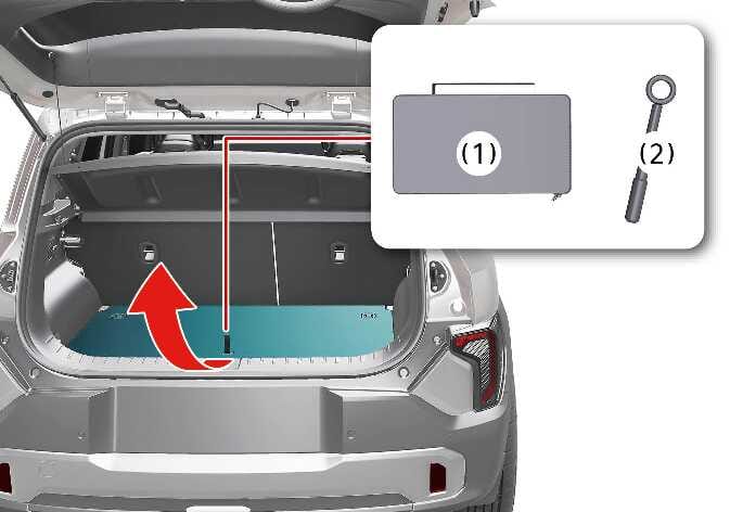Öffnen Sie die Heckklappe und nehmen Sie den Abschlepphaken (2) aus dem Werkzeugkasten (1).