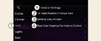 Select Settings → Vehicle → Seat from the Settings menu in the infotainment system screen, you may use various convenience functions.